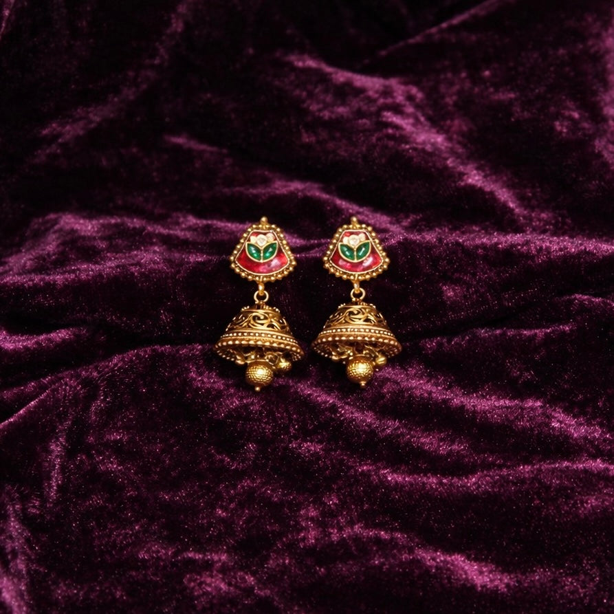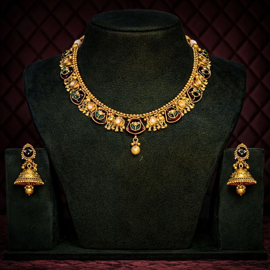 An exquisite antique gold choker adorned with delicate enamel detailing, paired with matching jhumkas for timeless elegance.