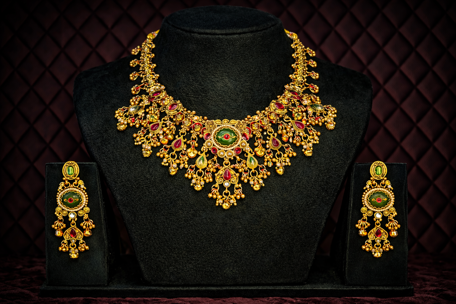Delicate dangling elements enhance the grandeur of the piece, creating graceful movement and depth. The matching earrings mirror the ornate artistry of the necklace, completing the set with perfect balance and harmony. Every element reflects traditional design aesthetics combined with refined craftsmanship.