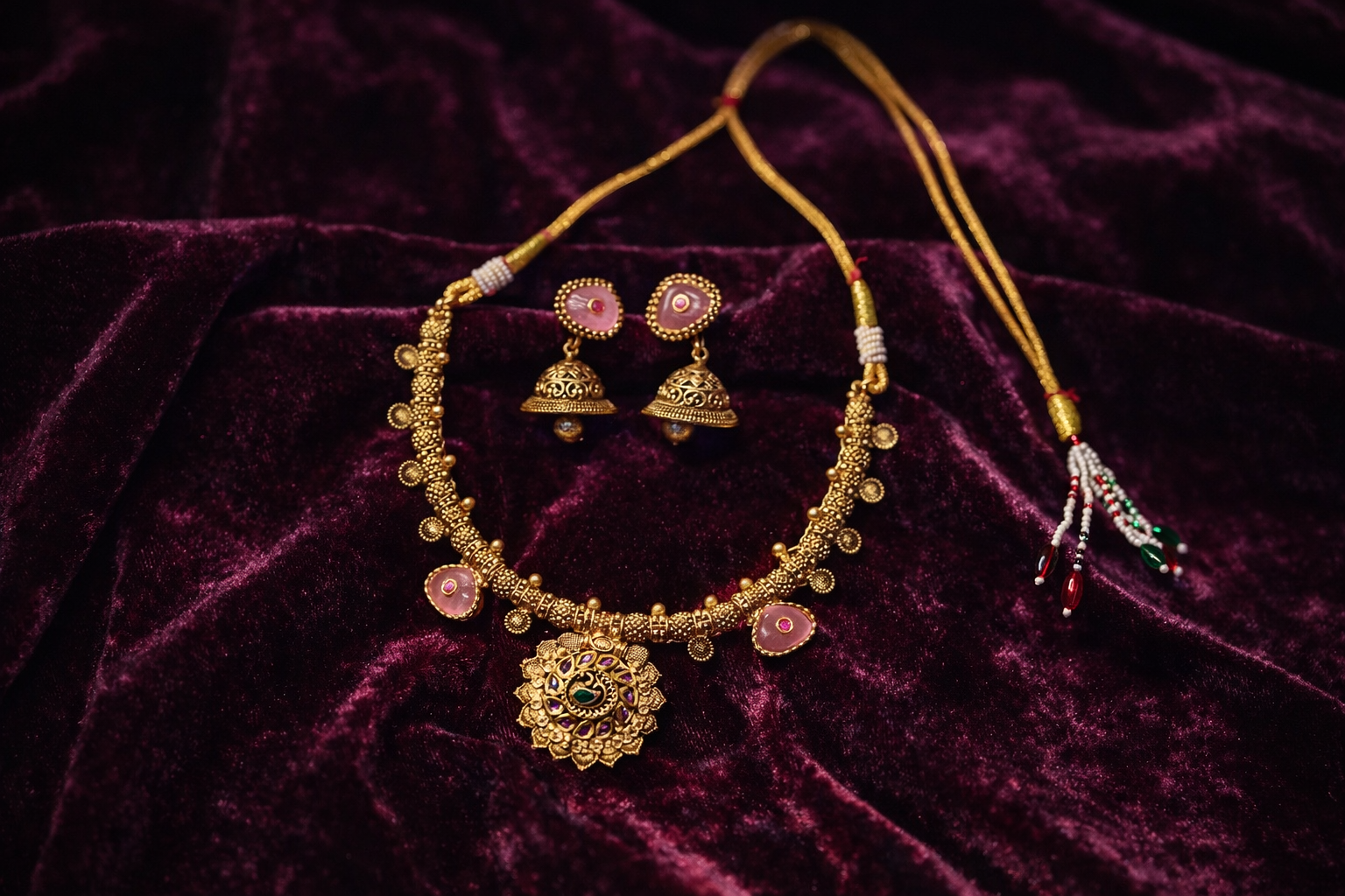 Accented with subtle ruby-tone enamel highlights, the necklace exudes warmth and richness while maintaining a balanced, elegant look. The matching jhumka earrings mirror the intricate craftsmanship of the necklace, completing the set with graceful harmony.