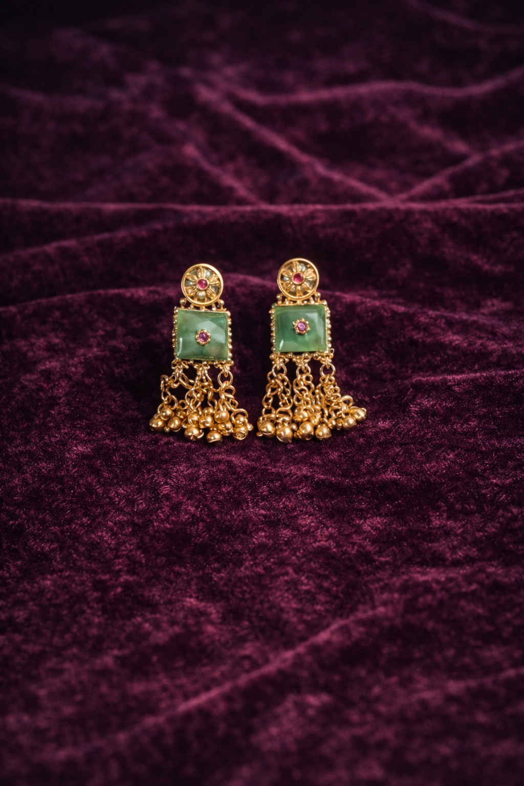 The standout centerpiece is a majestic enamel-finished pendant, designed with fine craftsmanship and embellished with delicate stonework. Cascading gold-toned hangings add graceful movement and grandeur, making this piece truly eye-catching. Paired with matching drop earrings that mirror the pendant’s design and dangling details, this set creates a perfectly coordinated and luxurious look.